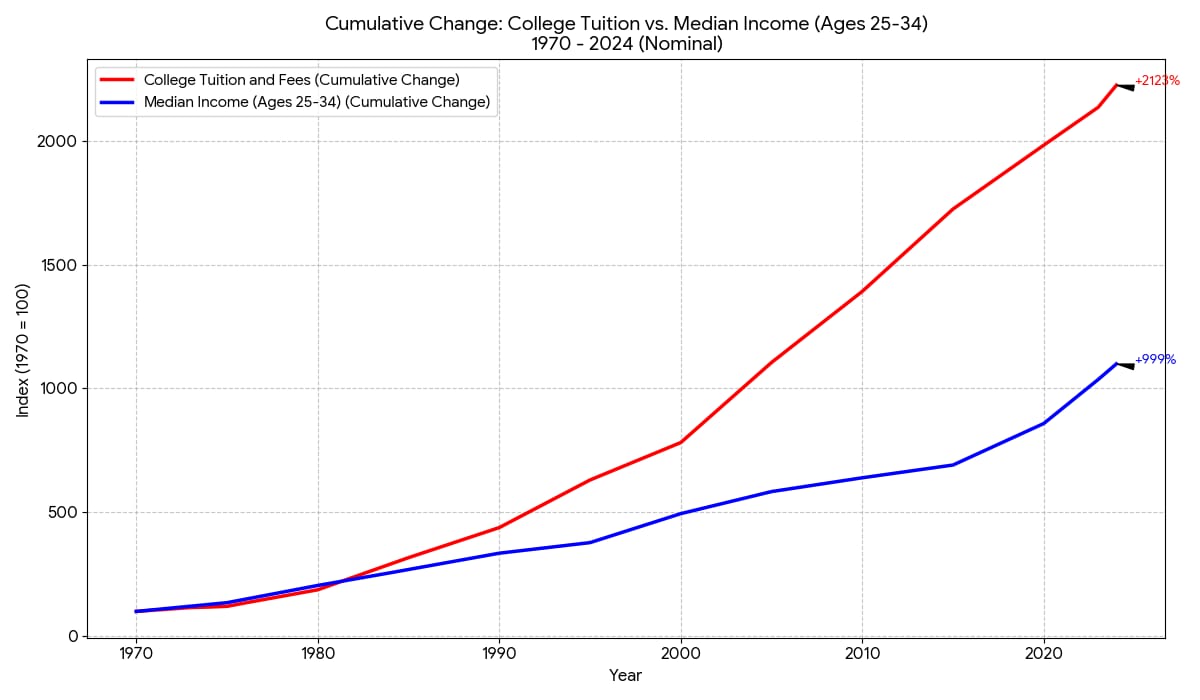 The article graciously admits that college costs "shot up," making student loans a ballooning, crushing burden. But don't worry, economist Constantine Yannelis reassures us that Millennials just "earned less and studied more in their 20s" because they were busy making "large investments in education." Ah yes, "investing" in a system that completely exploded in price compared to 1970.