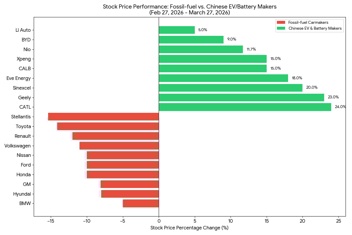 The real winners? Chinese EV and battery makers, whose share prices have surged since the war began while traditional automakers hemorrhage value. The average upside for Chinese EV and battery makers: +15.63%. The average downside for fossil-fuel carmakers: -10.36% (see the chart above).