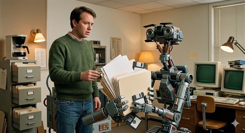 Satirical AI image of you handing Johnny 5 all your health data, created by your Chedditor in Google’s Nano Banana Pro